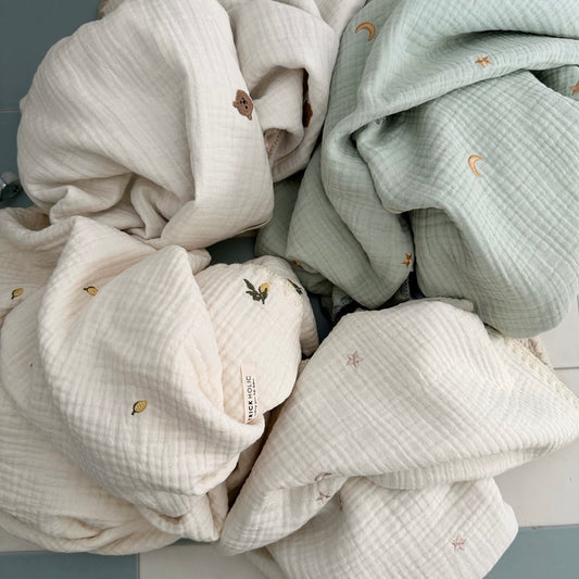 《OUTLET》6重ガーゼブランケット星月/くま/レモンの刺繍 Lサイズ